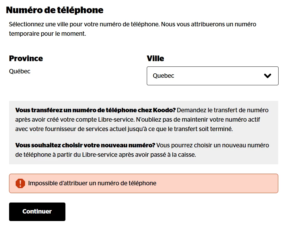 je tente d’ouvrir un ligne mobile. Après avoir entré toutes les informations requises et passé la verification de crédit, il m’est demandé de sélectionner une ville pour avoir un numéro de téléphone. J’obtiens alors le message d’erreur “impossible d'attribuer un numero de telephone” et ce peu importe la ville que je choisis. Après un moment, j’ai rafraichis la page et je suis de retour au début du processus comme si ma demande avait disparu. Avez vois une idée de ce qui pourrait poser le problème?
