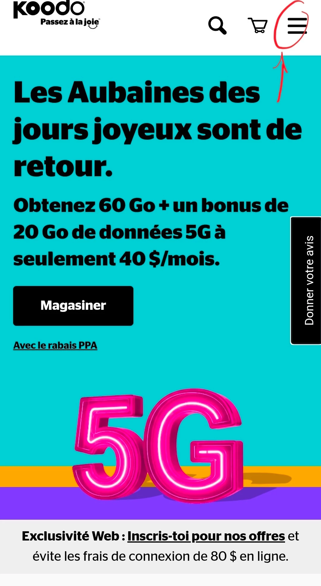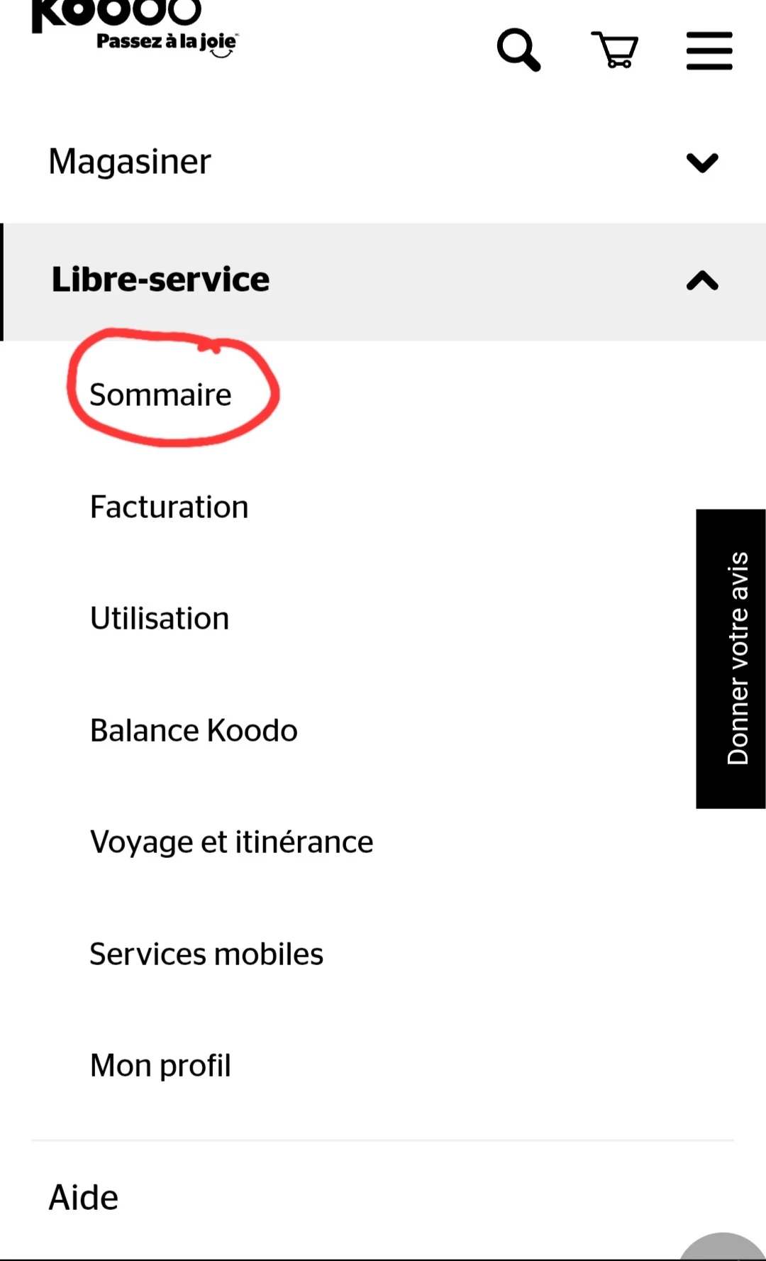 Lorsque vous vous rendez sur le site web de Koodo, suivez les instructions dans les images ci-dessous. Vous serez alors invité à vous connecter à votre compte et ça vous renderez a votre sommaire de compte.