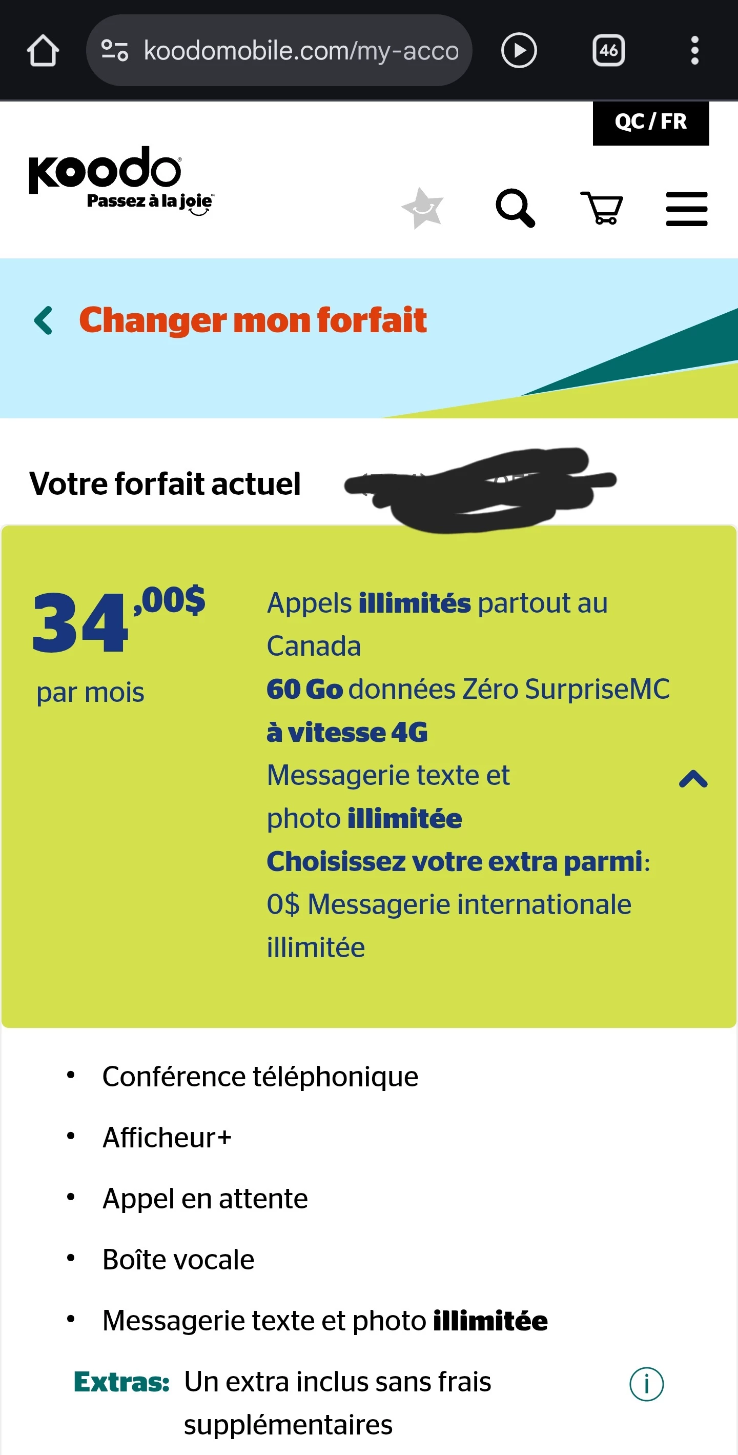 Quand avez-vous souscrit à votre forfait cellulaire ? L'année dernière ou il y a quelques mois ? Actuellement, aucun forfait à 34 $ n'est disponible chez Koodo. Quoi qu'il en soit, je vais en informer un conseiller afin qu'il se renseigne.