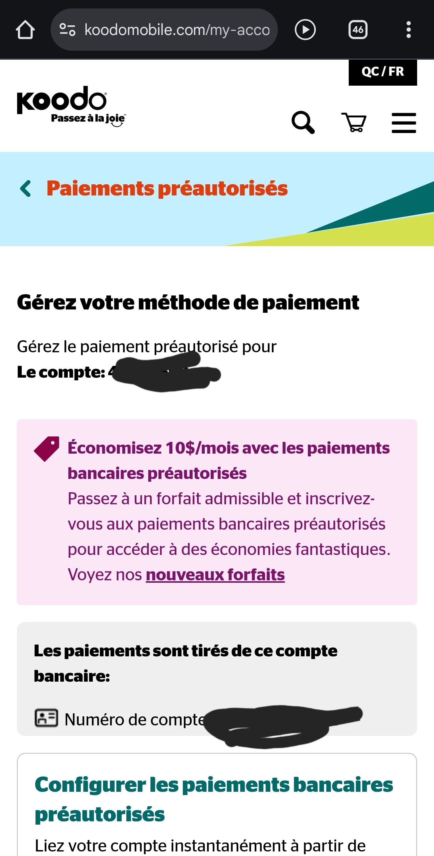 J’ai configuré mon compte avec ma carte bancaire habituelle, juste après l’activation de mon service Koodo. Le paiement préautorisé a d’ailleurs déjà été effectué lors de mon premier règlement (136 $) suite au changement d’opérateur. Cependant, je viens de recevoir ma deuxième facture et je ne constate aucun rabais ni ajustement appliqué.