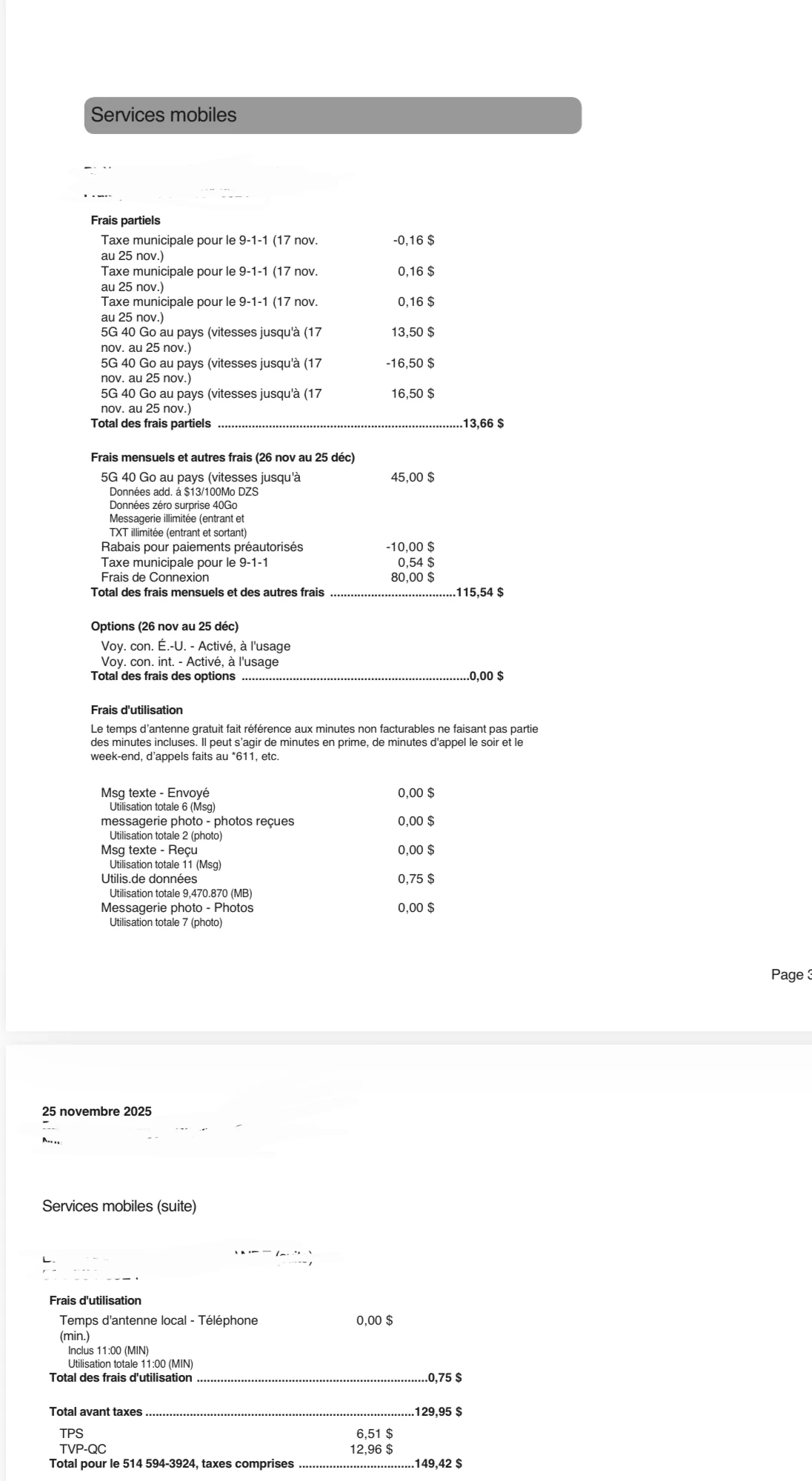 J’ai pris un forfait à 45 $/mois, activé en eSIM le 17 novembre. La facture reçue le 27 novembre affiche un total de 149,41 $.