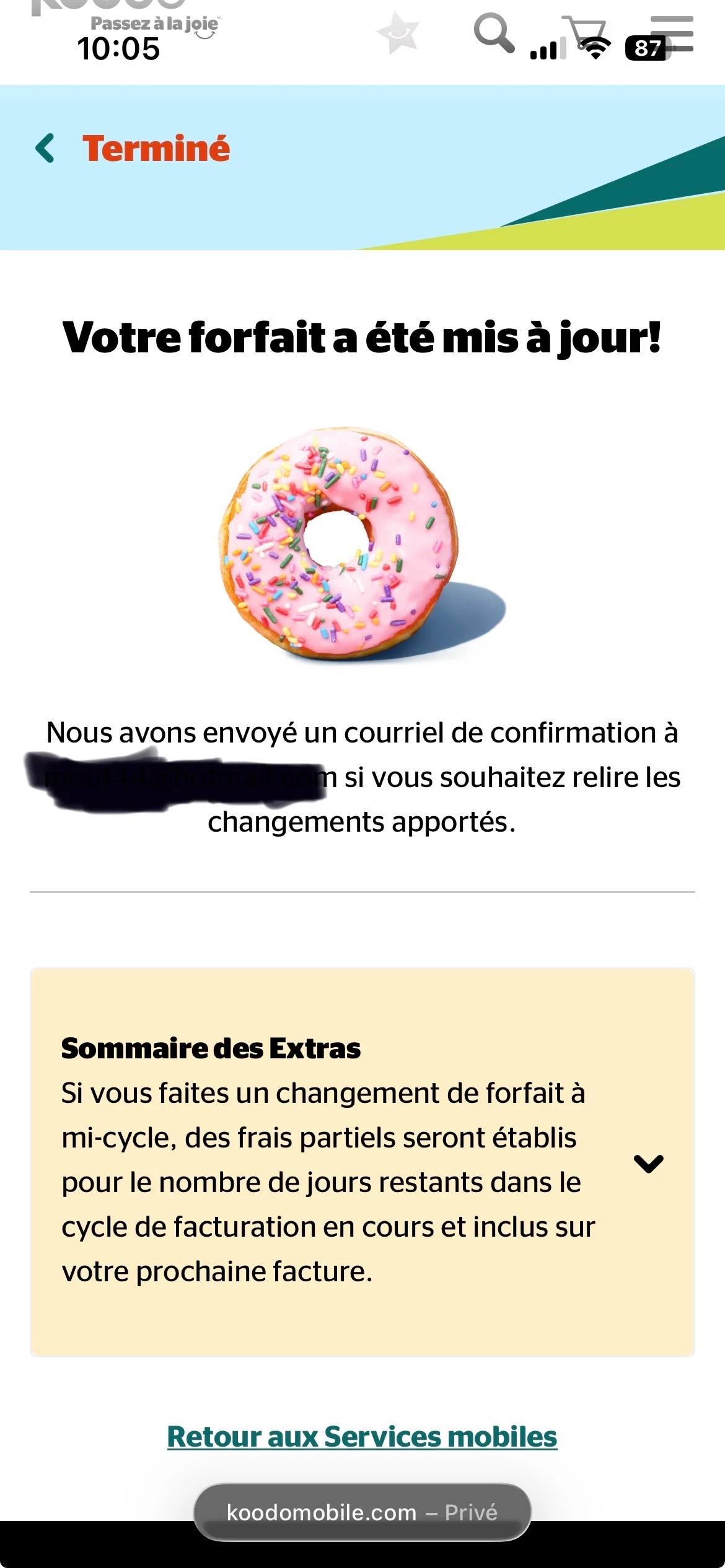 Bonjour je me suis abonné à Koodo mobile il y a 4 jours” J’ essaie depuis de terminer mon activation mais impossible de choisir mon extra gratuit mais ça ne fonctionne pas. Au début quand je cliquait ça affichait impossible d’ ouvrir la page et maintenant ils disent qu’ils vont m’envoyer un corriel de confirmation qui n’ arrive jamais. je ne sais pas ce qui ce passe mais mon expérience avec le libre service koodo est très désagréable jusqu’ à maintenant